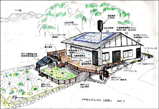 昼間の太陽光発電(系統連携の制度利用)、深夜電力の 有効活用(蓄熱・蓄電)、太陽熱、小型風力、地中熱などの 利用と、良質な木質構造や特殊遮熱塗料など、